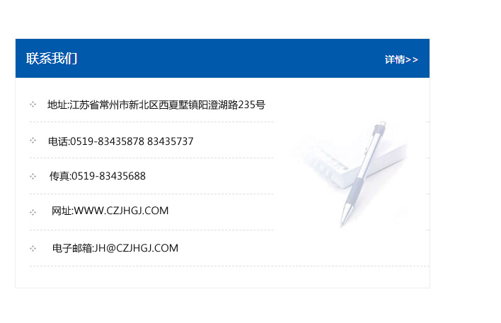 傳真:0519-83435688    郵編:213135    網址:WWW.czjhgj_com.shipanmiye.com    電子郵箱:JH@czjhgj_com.shipanmiye.com